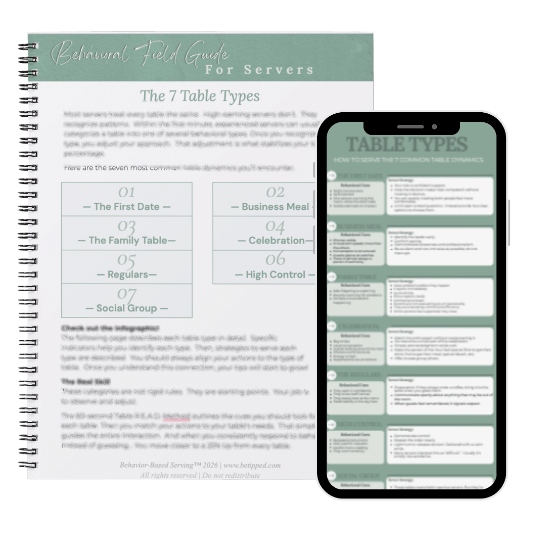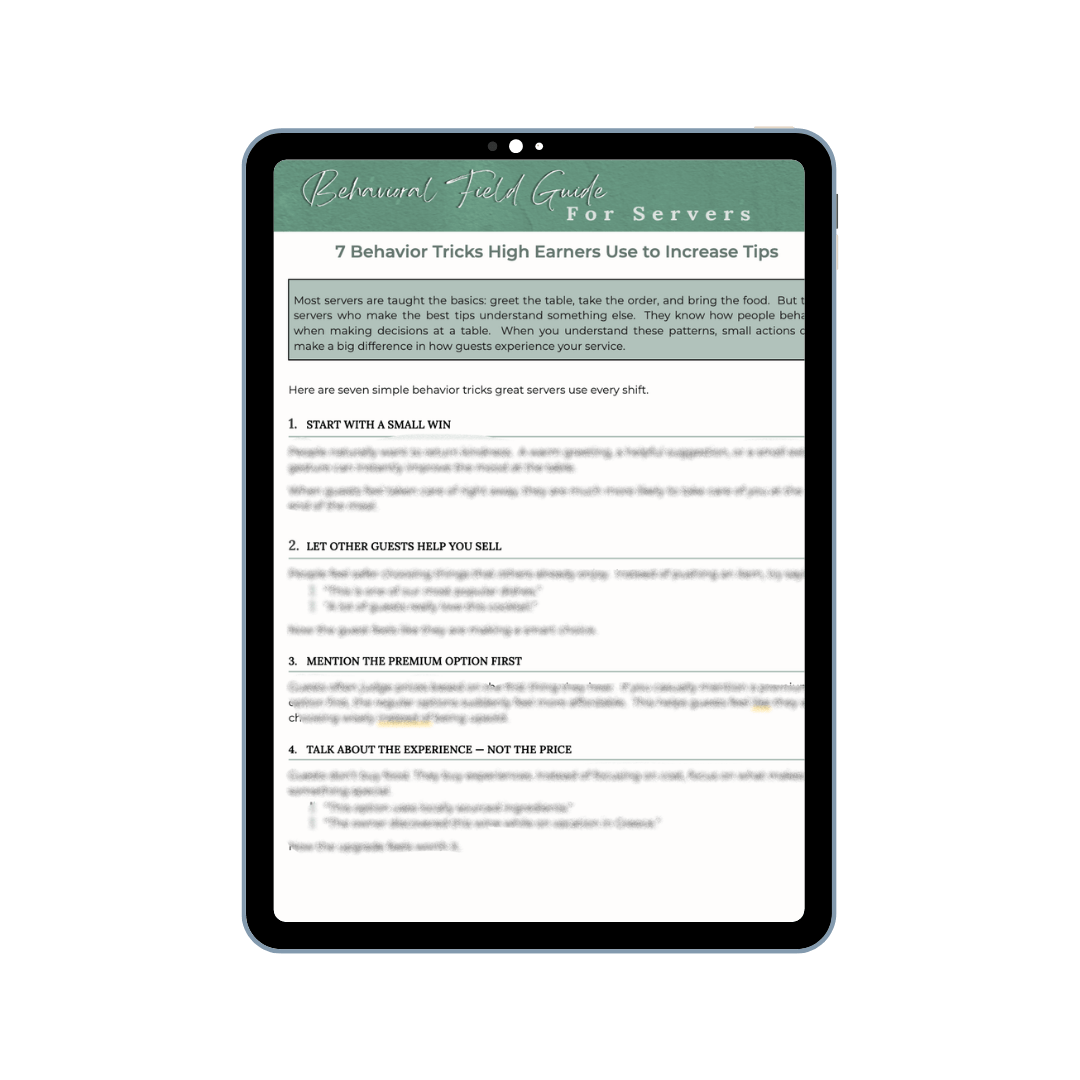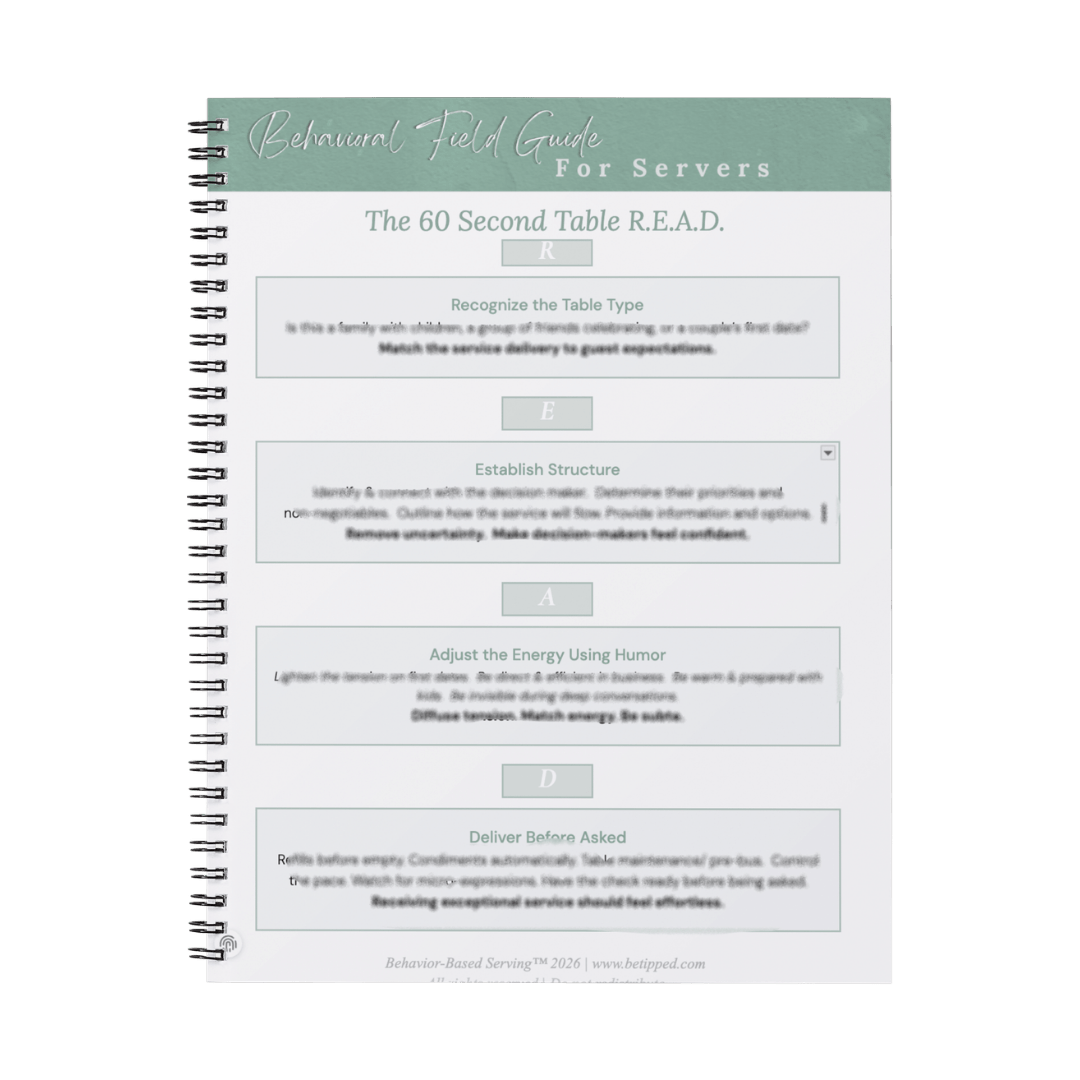 The Behavioral Field Guide for Servers gives you a simple way to observe guest behavior and adjust your service accordingly, so you can create a better experience for every table without feeling fake or pushy.